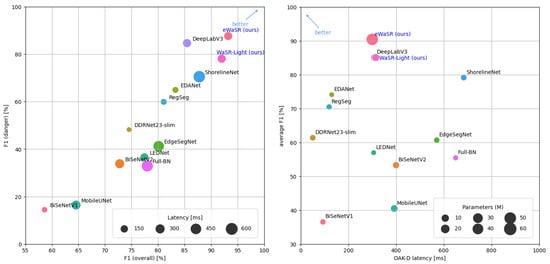 eWaSR is compared with 12 state-of-the-art or high-performing architectures designed for maritime or general semantic segmentation. Specifically, we evaluate the performance of BiSeNetV1 [,], BiSeNetV2 [], DDRNet23-Slim [,], EDANet [], EdgeSegNet [], LEDNet [], MobileUNet [], RegSeg [], ShorelineNet [], DeepLabV3 [,], ENet [], and Full-BN []. Table 4 shows that eWaSR outperforms all these methods in the overall and danger-zone F1 score. It ranks fifth in latency on OAK-D but outperforms all faster models by over and F1 overall and inside the danger zone, respectively. The excellent latency–performance trade-off of eWaSR is further confirmed in Figure 5.