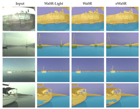 Figure 6 shows qualitative comparison of eWaSR, WaSR-Light, and WaSR for further insights. We observe that eWaSR predicts fewer false positives in the presence of land and in the distance and predicts more accurate segmentation masks on distant vessels and their reflections. However, its performance is limited on large homogeneous and textureless surfaces where it is prone to misclassification. On the contrary, WaSR performs better in such cases, but predicts more false positives in presence of the piers. All models appear to experience false detections in some cases in the presence of wakes and glares, which is a point requiring further research in maritime obstacle detection.