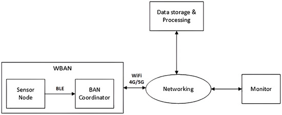 The body area network coordinator (BAN coordinator), which can be a smartphone, a PDA, or a laptop, collects sensed data from implantable and/or wearable sensors and uploads them to the remote station via one of the available networks (WIFI, 4G/5G, etc.) for storage and future processing.