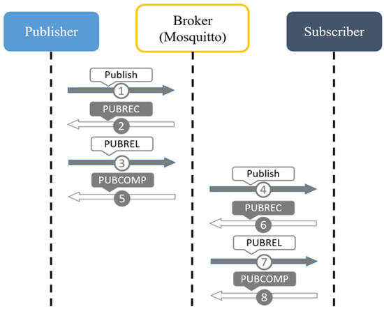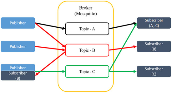 MQTT’s message delivery uses the Publish/Subscribe mode, which contains four important elements: Publisher, Subscriber, Topic, and Broker, and provides three QoS levels for message delivery services for users to choose from. The data flow of transmission is shown in Figure 2. The Broker is a message relay station. It transfers messages within a Topic from a Publisher to a Subscriber. A Topic is a keyword used by the MQTT Broker to filter messages against the MQTT client. Users in Subscriber mode inform the message relay (Broker) of the Topic they want to register and become the Subscriber of this Topic. When messages from Publishers were sent to this Topic, the relative Subscriber would obtain these messages. Each Subscriber can register for more than one Topic.