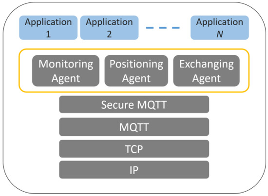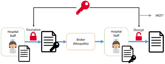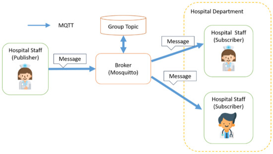 Therefore, this study implements a medical information management platform through the Internet of Things (IoT) transmission protocol, MQTT, to integrate the work information of healthcare workers, and its protocol hierarchy is shown in Figure 6. The platform provides three different types of agents, namely, Monitoring Agent, Positioning Agent, and Exchanging Agent. Medical Data Monitoring, Medical Equipment Positioning, and Message Exchanging help healthcare professionals quickly grasp the real-time situation of patients and track the positioning of medical equipment and devices to facilitate the management of medical staff, reducing the workload of medical staff. In addition, the presented system also copes with the lack of security mechanism in the information transmission process of the MQTT protocol and conducts data content protection [37], which is to design a security mechanism (Secure MQTT) on top of the MQTT protocol to encrypt and protect the content of the information transmission. The platform allows healthcare users to transfer and exchange data with confidence to avoid the leakage of patients’ private information.