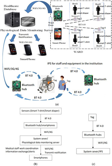 (a) System usage scenarios, (b) workflow chart for smart sensors, (c) workflow chart for IPS.