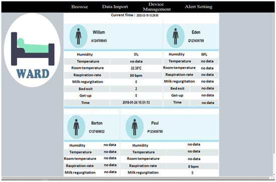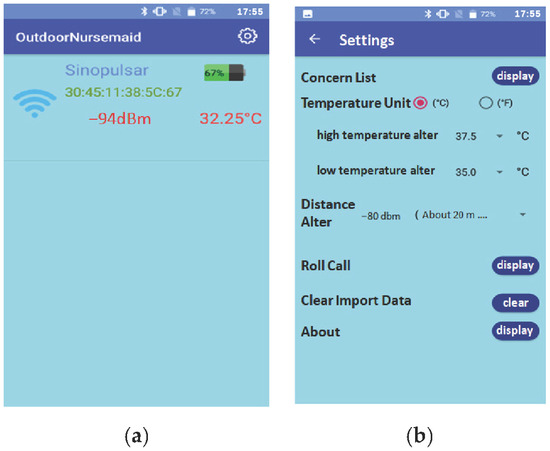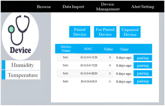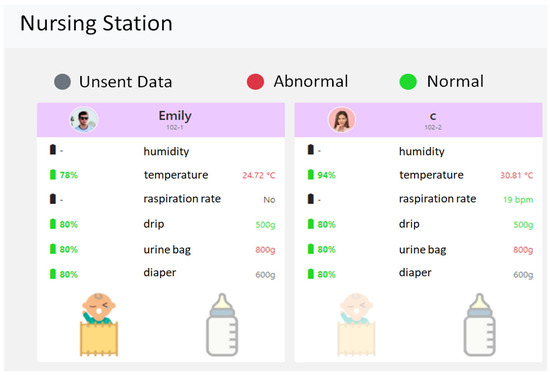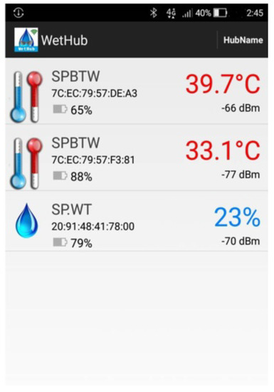 Figure 7a shows the system usage scenarios, where care recipients wear smart T-shirts/diapers in the ward, and the Bluetooth Hub at the entrance of the ward and the APP-Hub (either BT or WiFi) on the smartphone are running the information collection program to collect the body temperature and diaper humidity information of the care recipient through the multi-channel Bluetooth transmission protocol. Figure 7b,c illustrate the workflow chart for smart sensors used to collect physiological data and Bluetooth tags used for indoor positioning, respectively. The Bluetooth Hub sends physiological data to the system server. The system server can transmit notifications/alerts (work coordination information exchange or indoor position information) to smartphones via WiFi/4G. Figure 8 shows the screen of the APP-Hub program to collect temperature/humidity information. The screen shows that the body temperature and diaper humidity information from different care recipients is collected, and the information is then forwarded to the back-end physiological information collection server for monitoring via WiFi/4G wireless transmission technology. Figure 9 shows the pairing screen of the patients and their physiological sensors.