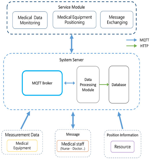 The architecture of the presented system is shown in Figure 11, which is divided into System Server and Service Module. The MQTT Broker server is installed in the back-end server to receive the information collected in the medical institution, and the medical information is mainly from the following three sources: