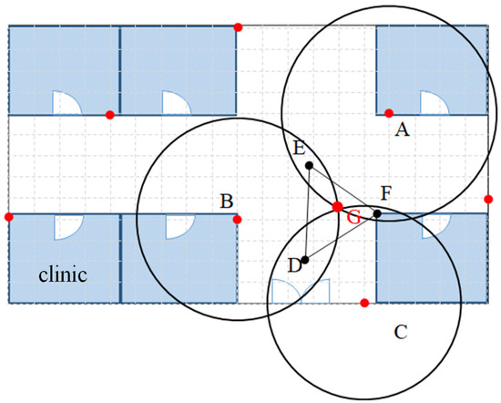 In order to compare the accuracy of the intersection method and the accuracy of the fingerprinting positioning method, the test data were obtained by the sensor carried by a user walking from cell #2 to cell #49 (12 cells in total) illustrating by red arrows, as shown in Figure 30. One hundred points (signal samples) in each cell were collected by each of the four Hubs. A total of 4800 points (12 cells × 100 points × 4 Hubs) were collected. These data were then pre-processed and combined into 1200 entries, and each entry represents the locational signal strength data set received by the four Hubs at the same time. The coordinates of the sensor location were first calculated by performing the intersection method based on the signal strength collected from the Bluetooth Hubs. According to the actual experimental results, the average positioning accuracy of the circle–circle intersection positioning technique is 2.5 m. This is sufficient for the purpose of locating medical equipment and devices in the institution, although it is not good enough for navigation purposes. The calculated coordinates were further converted into cell numbers. The obtained cell numbers were then compared with the true location cell numbers, and the accuracy of the intersection method was only about 39%. The main reason is that each cell is about 1 square meter in size, and the intersection positioning accuracy resolution would fall out of that range sometimes. Therefore, it is found that most of the positions calculated by the intersection method fall in the surrounding cells of the correct cell, and this error is not allowed for the safety management of patients or care recipients.