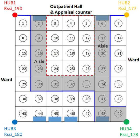 A 10 × 8 m2 indoor space was used as the experimental environment; it was divided into 49 cells, of which each is approximately 1 m2, as shown in Figure 27; each cell was numbered 1, 2, 3, 4, …, 49 from top to bottom and left to right. Four Bluetooth Hubs were built at the four corners of the environment (cells #1, #7, #43, and #49) in order to collect the signal strength of the sensor being positioned and the signal strength of the sensor collected by each Bluetooth Hub was used as the feature of the sensor in the cell. In this experimental environment, there are tables, chairs, computer equipment, iron cabinets, etc. The rectangular diagram in Figure 27 represents the iron cabinets, which are more likely to block the Bluetooth signal. This experimental environment is used to simulate the medical site, such as the outpatient hall and appraisal counter in the lobby (cells #3~5, #10~12, #17~19, and #24~26), the aisle area outside the ward (cells #6, #13, #20, #27, #34, #41, #48, #2, #9, #16, #23, and #30~33), the area inside the ward mostly contains beds and metal cabinets (cells #37~39 and #44~46).