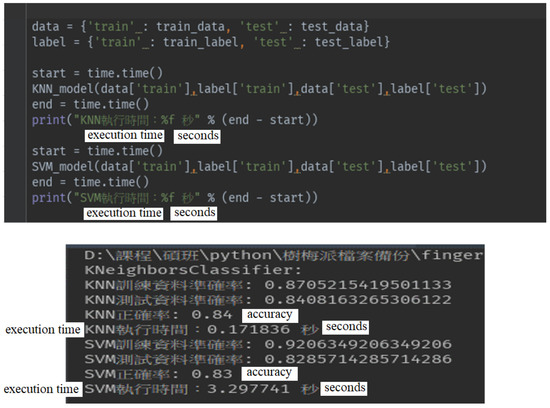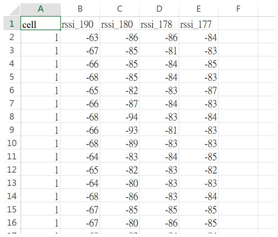 In order to collect the signal strength of the sensors in each cell, a sensor was placed in the center of each cell and simulated to be worn by the user (this sensor was placed 110 cm above the ground). Each Hub collected 100 points of signal strength. A total of (49 cells ×100 points × 4 Hubs) and 19,600 samples of data were collected. The data collected by the four Bluetooth Hubs were combined through the time stamp of the sensor, and the signal strength data originally uploaded in a single entry were now combined into the signal strength data set received by the four Hubs at the same time, as shown in Figure 28, with a total of 4900 entries, providing the necessary data for the machine learning models. A total of 4900 signal entries were divided in a ratio of 9 to 1. 90% of the data were used as the training data and 10% as the test data, and the RSSI signal strength was used as the feature value and the cell number as the label. The data were trained using KNN and SVM. Figure 29 shows the accuracies and execution times of these two models. The accuracy and execution time are 0.84 and 0.171836 s for KNN, and 0.83 and 3.297741 s for SVM.