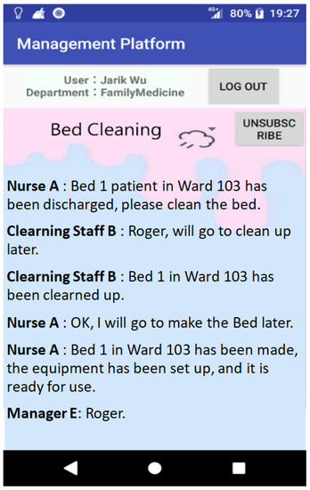 Through the presented platform, healthcare workers can exchange opinions with each other and disseminate information in specific medical departments. Take bed cleaning as an example; after the physician approves the patient’s discharge, the medical staff will notify the patient that he/she can be discharged, and the used bed needs to be cleaned before it can be provided to the next patient for use. The process of bed cleaning is shown in Figure 31, in which the nursing staff needs to notify the cleaning staff to clean the bed first, then the nursing staff needs to be notified again to make the bed and set up the medical equipment after the cleaning staff has finished, and finally, the nursing staff notifies the bed manager to complete the bed cleaning procedure. Through this platform, the bed cleaning staff can create a Topic for bed cleaning, under which they can notify or be notified of the bed cleaning and understand the usage status of the bed (as shown in Figure 32).