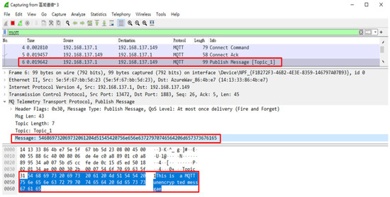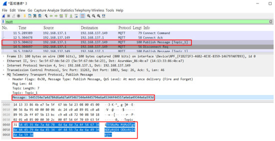 In this study, we encrypted the contents of messages when they were transmitted by users through the message security protection mechanism. When we intercepted the message packets sent by users to MQTT Topics through the packet capture software (WireShark), we found that when the message security protection mechanism was not used, the contents of the transmitted messages were obviously presented directly in the packet contents (Figure 33), and sensitive personal information could be easily stolen. When the message security protection mechanism is used to encrypt the message contents, the intercepted packets do not show the original message contents, but the encrypted irregular garbage code (Figure 34), and the decryption key is needed to restore the message to the correct contents.