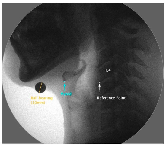Frame-by-frame analysis determined the resting and maximum displacement positions of the hyoid bone. Still images were generated from the videos to capture these two positions for measurement. Using imaging software, ImageJ 1.53, the images were scaled using a ball bearing (10 mm) and analyzed to identify the coordinates of the most anterior and inferior point of C4 for a reference point and the most anterior and inferior corner of the hyoid bone, as seen in Figure 2.
