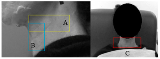 The external regions of analysis. Box A (yellow) represents the skin ROA for the hyoid bone; Box B (blue) represents the ROA for the larynx; and Box C (red) displays the anterior ROA.