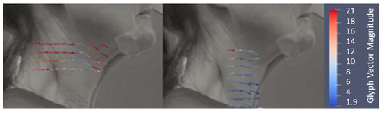 External visualization of skin displacement vectors (red and blue arrows). Left: skin displacements in the hyoid bone region of interest. Right: skin displacement in the laryngeal region of interest. Scale: a color scale representing the magnitude of skin displacement vectors.