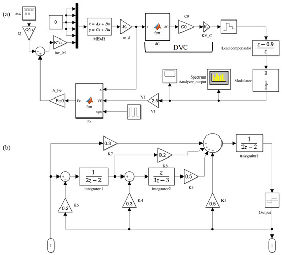 EM-ΣΔM system based on MDOF-EM model of the sensing element. (a) Overall system; (b) Subsystem of the sigma–delta modulator. DVC denotes the displacement–voltage conversion block.