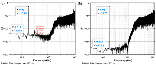 Because the high-order natural modes considering the bending of the fingers are excited into resonance, the finger displacement term (a − b) must have high power around the high-order natural frequencies. On the other hand, the output So also has high power around the high-order natural frequencies because the noise shaping of EM-ΣΔM moves the power of the output noise to the high-frequency band, as shown in Figure 4a. As a result, the product of the finger displacement term (a − b) and output So must produce low-frequency forces in the bandwidth via frequency mixing. These low-frequency forces add extra acceleration to the bandwidth, so extra low-frequency noise appears in the output. Meanwhile, the additional acceleration at the frequency where the harmonic occurs enhances the harmonic distortion term.