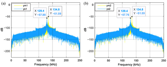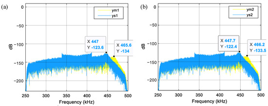 Simulated PSD. (a) MDOF EM-ΣΔM system; (b) SDOF EM-ΣΔM system.