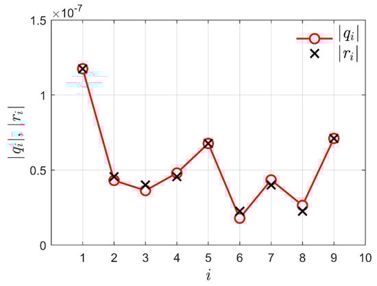From this figure, it can be seen that the values of and are not pairwise equal, except for the diagonal elements of , which correspond to , , and . Nonetheless, there is a compensation effect in the sums that can be observed in the values of , , and : notice that is shifted below approximately the same amount that is shifted above ; analogously, is shifted below approximately the same amount that is shifted above ; and is shifted below approximately the same amount that is shifted above . As a consequence, , which produces a negligible modification in the numerator of with respect to the numerator of . The same reasoning applies to the denominators, that is, . Thus, there is a small difference between and , which guarantees that their performances are approximately the same, to be confirmed by the results presented in Section 4.