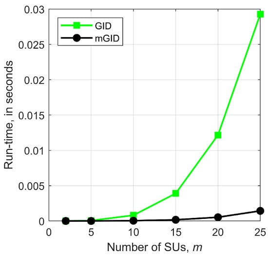 In order to assess the time complexities of the GID and mGID test statistics, run-time measurements were carried out for them, as a function of the number of SUs, m, using a computer with an 11th Gen Intel Core i7-11800H @ 2.30 GHz processor, with 64 GB RAM, running the Windows 11 Professional and the 64-bit Matlab R2018b, and measured via the Matlab functions and . These functions were respectively placed before and after the subroutine that computes the corresponding test statistics in the Matlab code [16]. The resultant measurements are shown in Figure 3.