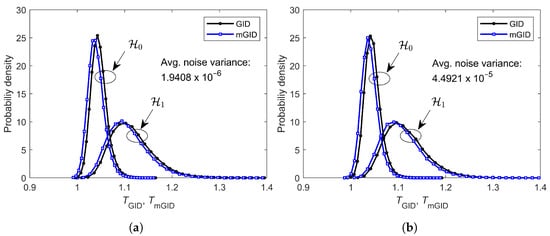 From Figure 4, it can be seen that the supports of the PDFs of under do not change when subjected to different noise variances, the same occurring with . Hence, given a predefined decision threshold, the probability of a false alarm will not change with the noise variance, which confers the CFAR property to the GID and mGID.