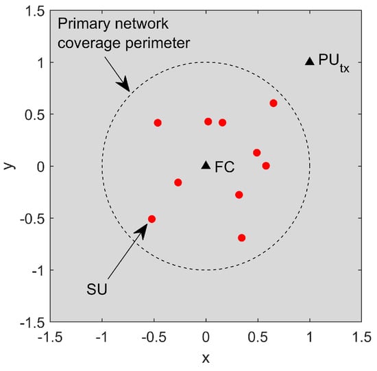 CSS topology for SUs, normalized coverage radius m, FC at m, and PU transmitter at m.