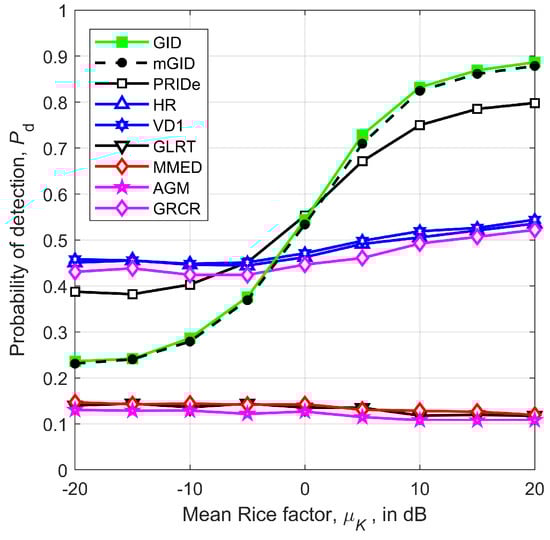 The main result unveiled by Figure 6 is the influence of the line-of-sight condition from the PU transmitter to the SUs on the performance of the detectors, especially in the case of the GID and mGID. Firstly, notice that the GID and mGID achieve practically the same performances. Moreover, they become attractive under a moderate-to-high LoS component, i.e., for dB. Taking this fact into consideration, the remaining results of this section consider dB, which tightly approximates a pure AWGN channel. This is to explore the GID and mGID operations under the scenario corresponding to their best performances.