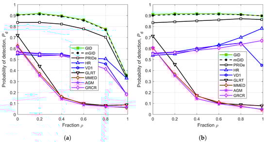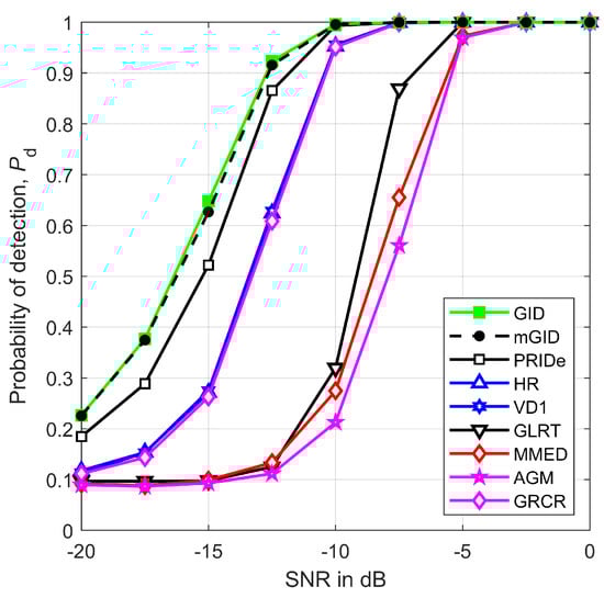 Figure 6 also demonstrates that the performance variation pattern of the PRIDe is similar to the GID and mGID, yielding a better performance for lower values of and a worse performance for higher values of . The other detectors exhibit low sensitivity to the variation in , with the GLRT, MMED, and AGM being practically useless. This is because these three detectors are not robust against variations in the received signal and noise levels, which are implicitly present in the setup used to plot Figure 6.