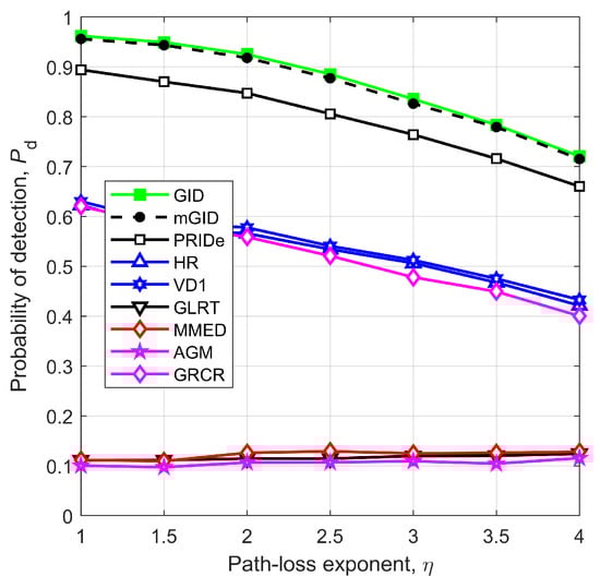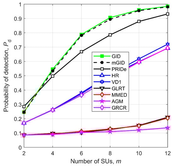 Figure 8 gives versus the number of SUs, m, for dB, , km, , , dB, and dB. As expected, the performances of all robust detectors improve as m increases, whereas the non-robust ones (GLRT, MMED, and AGM) do not follow this improvement pattern due to the deleterious influence of the signal and noise level variations. For the system settings considered in Figure 8, the GID and mGID considerably outperform the other detectors, closely followed by the PRIDe. Once again, the results show practically identical performances of the GID and mGID.