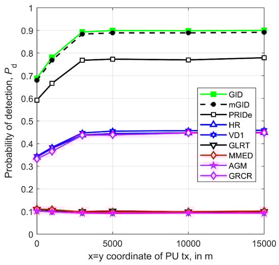 The influence, on , of the distances from the PU to the SUs, which depend on the coordinates of the PU, is shown in Figure 10 for , , dB, , km, , , dB, and dB. The non-robust detectors (GLRT, MMED, and AGM) are useless for any PU coordinate, which is owed to the variability in signal and noise levels and to the SNR value (see Figure 9). When the PU coordinates are below m, the performances of all robust detectors decrease due to the larger relative discrepancies among the received signal powers, similarly to what happens when the path-loss exponent increases. For above m, practically no performance changes are observed for all detectors, meaning that the relative discrepancies among the received signal powers were not capable of causing performance loss or improvement.
