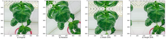 Data augmentation (Figure 5) is a common CNN regularization technique used to prevent over-fitting. The number of samples and diversity in the dataset is increased with processes such as image rotation and reflection [25]. In this study, preprocessing for images was applied only to the images in the training set. Considering that color differences and the addition of noise in the photos would affect the symptoms, basic processes such as mirroring, shearing, rotation, zooming and cropping were applied to photos. In addition, the brightness value was changed in a short range (±0.1) during data augmentation due to the different levels of brightness in the original photos caused by weather conditions.