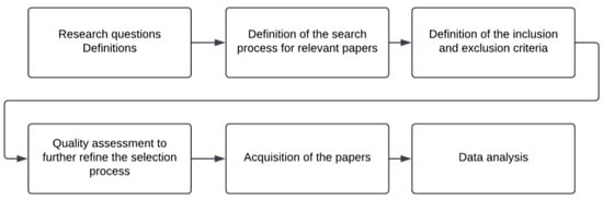 Critical to the conduct of any survey is the selection of a process to guarantee the validity, correctness, and effectiveness of the survey results. In particular, the adopted methodology (Figure 1) for conducting the systematic literature review [,] includes the following: