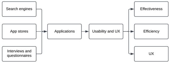 One of the main goals of the commercial applications comparison was to gain an understanding of the employed techniques, the trends as well as the popularity of commercial applications among the BVI communities. Part of this effort was to also understand the advantages and disadvantages of those solutions’ features, weight and cost-wise. A crucial issue was to compare the effectiveness and efficiency of these solutions as well as their perceived Usability and UX with the help of BVI individuals. We, also, included BlindRouteVision, an application developed by our research team in the context of the MANTO project [], to determine the effectiveness and efficiency of our approach as well. An emphasis was also given to uncovering the factors that make a successful commercial application for the BVI in which training is a crucial parameter and conventionally requires access to sites including special navigation utilities for the blind []. Finally, we conclude the presentation by highlighting the features found in the state-of-the-art literature that are easily transferred to the existing solutions. Figure 2 presents graphically the methodology employed to collect the commercial applications and evaluate them.