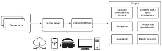 The overall architecture of the proposed solutions is presented in Figure 3. Several sensors either homogeneous or heterogenous in nature feed the proposed sensor fusion systems. The majority of these sensor fusion systems run either on single devices, including smartphones and computer systems or in collaboration with the Cloud and/or other resources found in the near vicinity. Their goal is to make either a decision or to give an accurate estimate on various aspects associated with outdoor and indoor navigation.