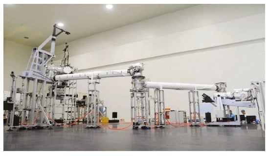Seven degrees of freedom (7-DOF) serial manipulators have advantages over non-redundant manipulators in avoiding singularities, overcoming obstructed environments, preventing joint limits, and optimizing joint torques [,]. They are also a hot topic in a wide range of research areas, especially for on-orbit service that could be highlighted by their uses in the space station remote manipulator system (SSRMS) (Figure 1), the European robotic arm (ERA), and the special purpose dexterous manipulator (SPDM) for the International Space Station [,], as well as in the core module manipulator (cmm) and experimental module manipulator (EMM) (Figure 2) for the Chinese space station remote manipulator system (CSSRMS) [,,], and the FREND [], SPIDER [], CAESAR [], etc. However, the inverse kinematics (IK) problem for 7-DOF manipulators is under-constrained and is more complex to solve due to the presence of a redundant DOF, usually called ’self-motion’ []. Many analytical solutions have been proposed for this problem, including methods based on joint angle parameterization (i.e., the fixed-joint-angle method) and methods based on arm angle parameterization (i.e., the fixed-arm-angle method).