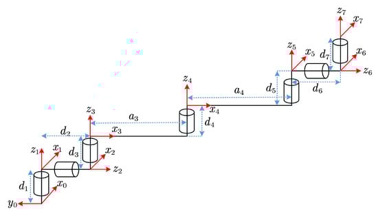 The joints of the SSRMS are arranged as (R-Y-P)-P-(P-Y-R), where each of the three joints of the shoulder or wrist has a link offset so that their axes do not intersect at one point, while the axes of the third, fourth, and fifth joints are parallel to each other []. The initial configuration and DH frames of the SSRMS-type manipulator are shown in Figure 3, where are the coordinate systems of the manipulator. The modified DH parameters [] are presented in Table 1, in which the shoulder offset , elbow offset , and wrist offset are nonzero. To visualize the geometric relationships when obtaining the inverse kinematics solution later, we introduced five auxiliary coordinate systems that coincide with the corresponding in the initial configuration. It is noteworthy that is fixed on the link so is defined with the same measurement angle from (or ) to (or ) with respect to .