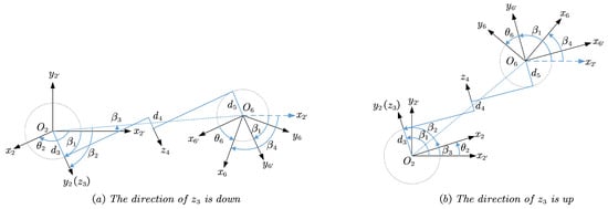 Equation (22) to Equation (24) stay the same when and are in opposite directions, and the pending positive and negative signs depend on the posture of the elbow, while whether and point in the same direction can be obtained by the value of , as in the case of solving . Rewriting Equations (22) to (24) yields two acceptable solutions from to for each input :