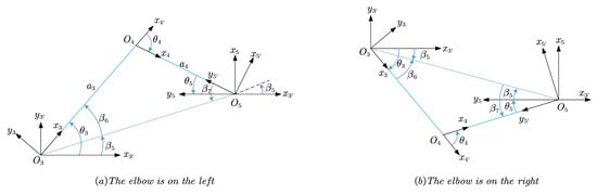 Projecting the axes of onto plane along the opposite direction of , the geometric relationship between them is shown in Figure 5 when and point in the same direction. As shown in the figure, depending on whether the pose of the elbow is on the left or right, two admissible configurations exist corresponding to each condition.