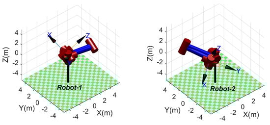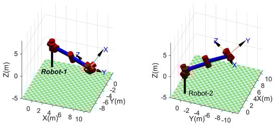 Two forward kinematics models for SSRMS-type and SRS-type manipulators, respectively, were established with RTB-M using the DH parameters listed in Table 1. Both manipulators are arranged in the (R–Y–P)–P–(P–Y–R) configuration, and the difference is whether the offset variables and are zero or not. Then, a total of 10,000 sets of joint angles with a uniform distribution ranging from to were randomly generated using the generator function embedded in MATLAB@ and were converted to 10,000 corresponding to the desired by the forward kinematics models. At last, both the proposed approach and function were used to solve the inverse kinematics for those given , and the statistics of the simulation results are listed in Table 3.