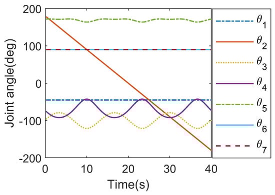 All of the mentioned singularity problems can be solved using the proposed method, no matter if it is caused by the method itself or the singular configuration of the SSRMS. For the sake of simplicity, this paper lists the solutions for an example ( = [0°, 0°, 45°, 125°, 45°, 0°, 0°]) of the second singular configuration given by [] . The corresponding desired homogeneous transformation matrix is computed with DH parameters listed in Table 1.