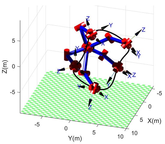 To verify the ability of the proposed method for planning the trajectory with singular configurations, an experimental task was set in which the end effector tracked a desired trajectory that was a superposition of a circle and an out-of-plane sinusoidal offset with an amplitude of 0.75 m. The circle has a center at (3.58, 3.58, 0) (m) and a radius of 5 m, and is located in the plane that is parallel to and 45 degrees to both and . The desired direction of is normal to the plane and the direction of is along the radial direction of the circle and away from the center. In this case, the proposed method encountered a singularity problem when the end effector moved to the top and the bottom of the direction. As a result, the planned joint angle curves shown in Figure 8 are continuous and vary smoothly, and the desired trajectory (black line) and some planned poses are visualized in Figure 9 using RTB-M.