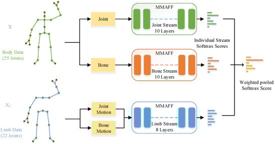 We used data from the three modalities of joints, bones, and limbs for training; then, we input the skeleton data of different modalities into the network framework, output the independent stream state softmax score, and finally performed score fusion on the independent output to obtain the final classification score—see Figure 2 for architectural details of MMAFF.