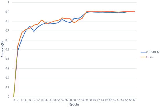For the evaluation of the model, not only accuracy but also convergence speed should be considered. In order to comprehensively evaluate the model proposed in this article, we conducted experiments on the X-Sub and X-View benchmarks of the NTU-RGB+D 60 dataset. As our model was improved on the basis of CTR-GCN, we compared the convergence processes of CTR-GCN and MMAFF networks. Details are shown in Figure 3 and Figure 4.