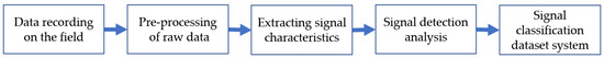 To develop a diverse passive acoustic monitoring (PAM) system capable of adapting to the challenges of complex underwater environments, research on marine mammal sounds can be divided into the following main areas: signal data recording in the field, preprocessing of raw data, extraction of signal characteristics, signal detection analysis, and signal classification dataset systems (Figure 1).