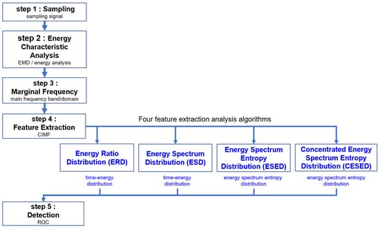 Based on the EMD method, four signal feature extraction and analysis algorithms are proposed, namely, ERD, ESD, ESED, CESED, and there are five main steps: sampling, energy characteristics analysis, MF distribution, feature extraction, and detection, as shown in Figure 2. The proposed method was applied in the field of marine mammal vocalization signal detection.