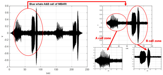 The marine mammal sound signals used in this study were obtained from the website of the Monterey Bay Aquarium Research Institute (MBARI), Moss Landing, CA, USA [29]. Figure 3 shows the A and B calls of two sets of blue whales with a sampling time of 235.72 s and a sampling frequency of 4800 Hz. One set of signals, A and B, belonging to the blue whales were captured as valid sampling signals during the experimental process of this study. The sampling time for this valid signal sampling was 100 s, 500 sampled signals were divided evenly, and each sampling signal lasted 200 ms. It can be observed that the first half of this valid signal sample contained 250 sampling signals for the A call zone of 50 s and that the second half contained 250 sampling signals for the B call zone of 50 s.