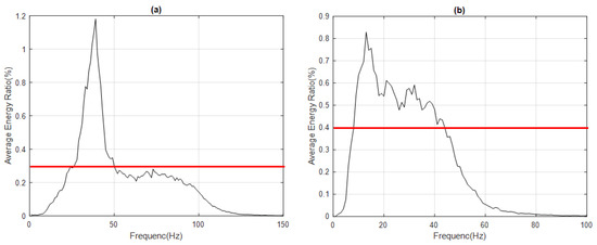 Further, the appropriate threshold was selected. As shown in Table 2, when the threshold was 0.3, the main frequency band of IMF1 was 27–49 Hz, the frequency of the highest energy ratio was 39 Hz, and the main frequency domain was 1–150 Hz; when the threshold was 0.4, the main frequency band of IMF2 was 9–43 Hz, the frequency of the highest energy ratio was 13 Hz, and the main frequency domain was 1–100 Hz. To observe the tendency of the MF spectrogram, the energy of the A call and B call signals was mainly distributed around the frequency of the highest energy ratio for IMF1 and IMF2, respectively.