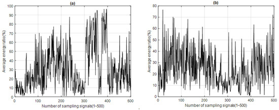 f: f1~f2 is the main frequency domain of the MF of the sampling signal. The time–energy distribution of each IMFi can be obtained for 500 sampled signals, as shown in Figure 7 for IMF1 and IMF2, which are the energy ratios of the IF with the highest energy in the MF. The energy distributions of the A call and B call can be clearly observed in Figure 7a for IMF1, but from Figure 7b it is almost impossible to identify the energy distribution of the B call for IMF2.