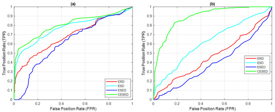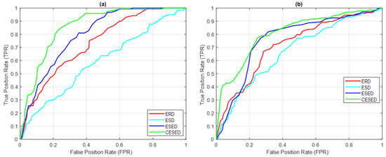 ROCs of ERD, ESD, ESED, and CESED for (a) IMF1 and (b) IMF2 for 500 sample signals (blue whale vocalization).