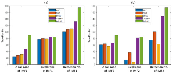 (a) The number of TPs in the A call zone of IMF1 and the B call zone of IMF1 and the detection number for IMF1 with ERD, ESD, ESED, and CESED. (b) The number of TPs in the A call zone of IMF2 and the B call zone of IMF2 and the detection number for IMF2 with ERD, ESD, ESED, and CESED.