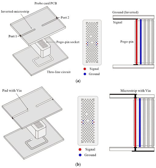 In recent pogo pin research, pogo pins up to 30 GHz, including the 5G band, have been analyzed. In particular, research has analyzed the transmission and coupling performance of pogo pin arrays up to 30 GHz using only High-Frequency Structure Simulator (HFSS) simulation [21]. Another study developed a prototype pogo pin probe that can operate with an insertion loss of 20 dB up to 30 GHz [22]. However, the prototype pogo pin structure differed from actual test environments because the PCB used had a vertical structure. Research has also been conducted recently on probe cards using dielectric sockets combined with PCB lines [23], a structure that is similar to the probe cards used in practical testing. The problems that occur when a dielectric socket, pogo pins, and a PCB are combined were analyzed through measurements, with resonance issues observed at 28 GHz when the height of the dielectric socket matched half the wavelength and radiation issues occurring in the high-frequency band. The proposed solution involves using short pogo pins to raise the resonance frequency, but this has practical limitations in terms of the ease of fabrication and the loss of durability.