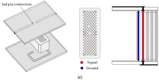 If the ground surface is placed at the bottom of the PCB, the coupling between the PCB line and the dielectric socket is weakened. However, when using the proposed microstrip design denoted as microstrip A in this paper in a traditional manner, with the outermost pogo pin used as the signal pin, other problems may occur. In general, the pogo pin located in the first column of the array is primarily used as the RF signal pin (the red pins in Figure 1a). This is because the outermost pin can be connected to the PCB line in the most simple and direct manner. Using internal pins can be challenging because the previous probe card PCB was designed with a typical inverted microstrip line structure in which the PCB line and pin are directly connected. If this connection method is applied to microstrip A, the signal line is connected to the pogo pin in the first column, and the ground surface is connected to the pin in the second column. In this case, the signal line and the ground surface are reversed. Therefore, at the connection point between the PCB line and the pogo pin, the E-field polarity of the transmission line is also reversed. As a result, the field polarity switches at both ends of the pogo pin, causing discontinuities at two points and leading to resonance caused by the length of the pogo pin. To eliminate the additional resonance that occurs in this PCB structure, an optimal position for the signal pogo pin is proposed.