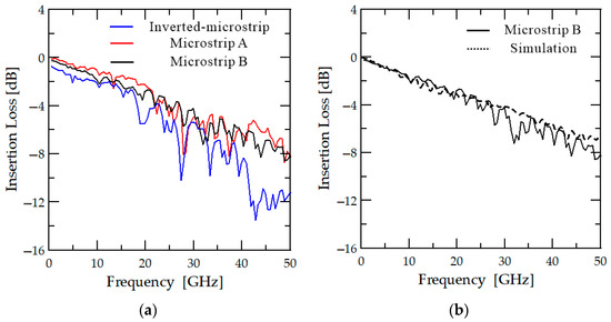 To determine whether the transmission performance of the probe card has improved, typical inverted microstrip and microstrip A probe card PCBs are also produced and tested. The results of the measurements are presented in Figure 5. In Figure 5a, the blue solid line represents the results obtained using the typical inverted microstrip line PCB with the ground at the top. Similar to in previous research [23], strong resonance occurs at a frequency of 28 GHz, and there is high-frequency band loss over 40 GHz. On the other hand, the PCB structure in which the ground surface is located at the bottom with a basic microstrip line exhibits reduced loss in the high-frequency band, and the resonance is weakened (the red line in Figure 5a). It is confirmed that the coupling between the PCB line and the dielectric socket causes a dielectric resonator problem. The red line in Figure 5a shows that weak resonance remains at a frequency of 28 GHz, but this resonance disappears when the polarity switch of the field is removed by optimizing the signal pin position, as shown by the black line in Figure 5a.